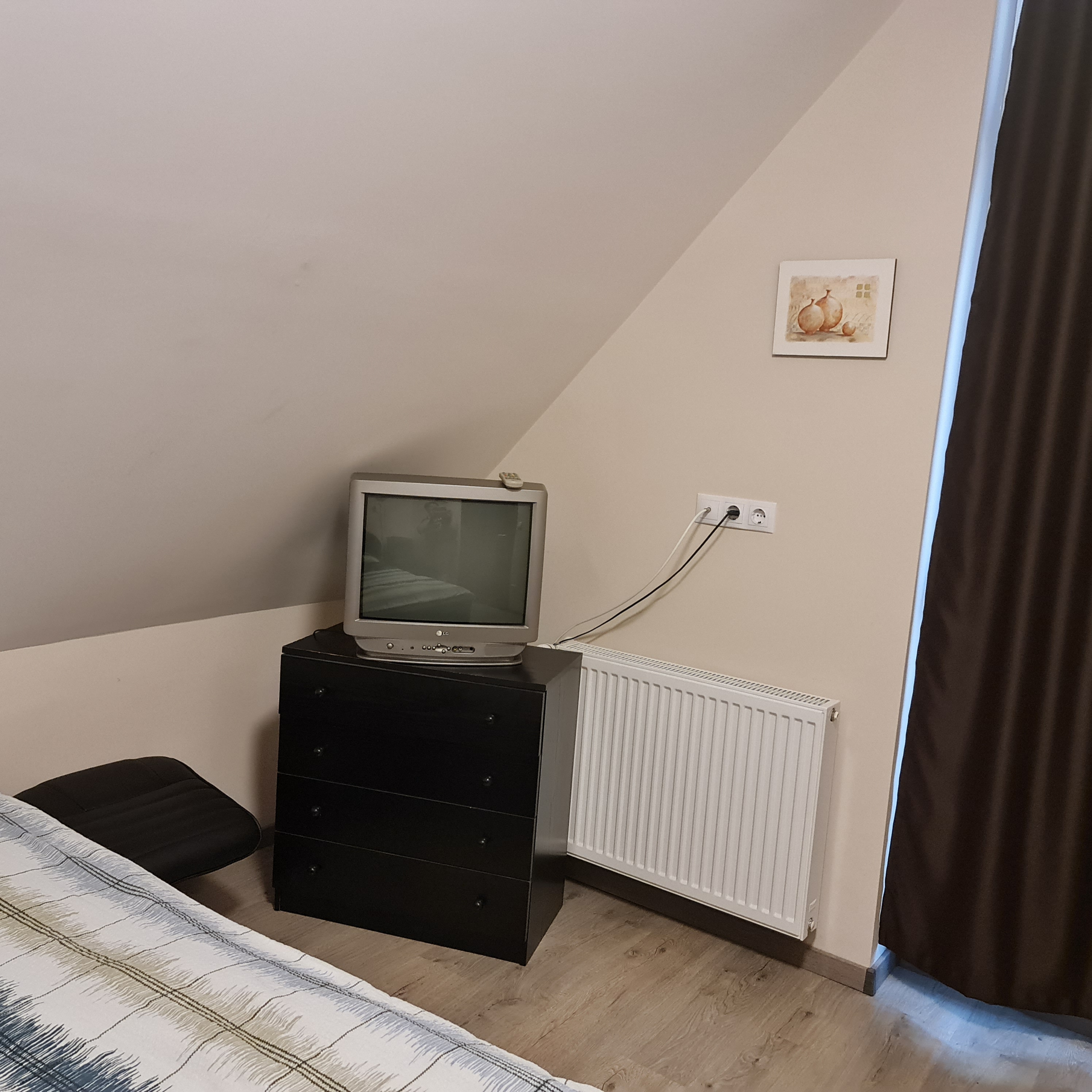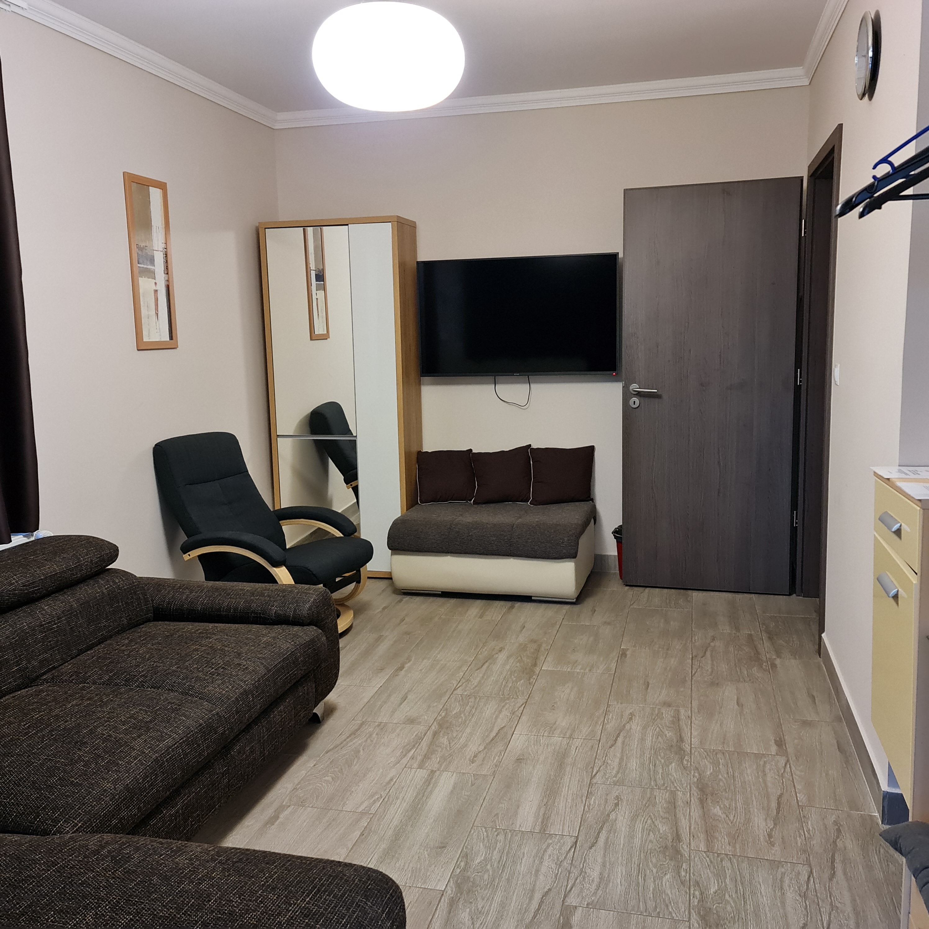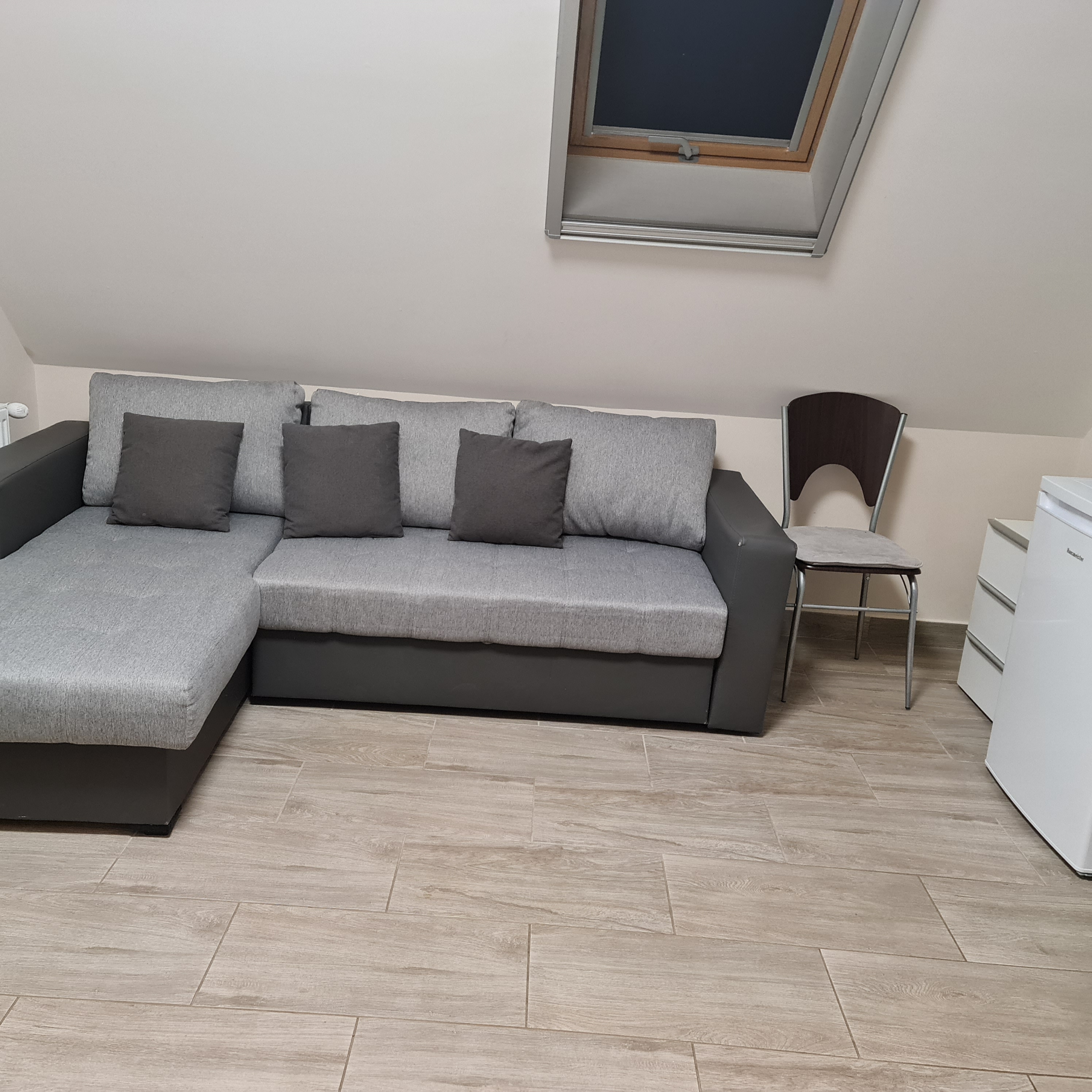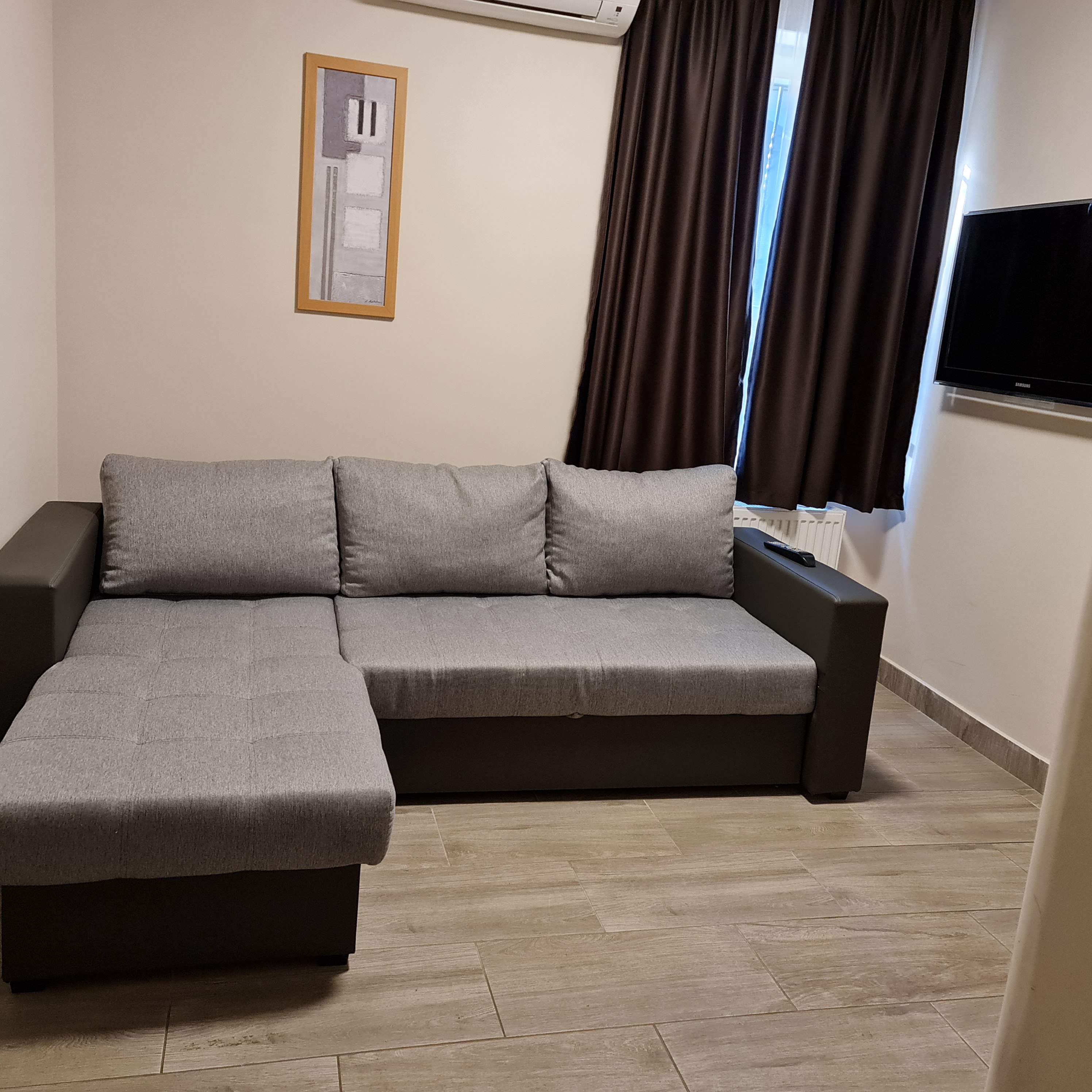 Nappali Sarok ülőgarnitúra kétszemélyes ággyá alakítható, memőria fedőmatraccal. Síkképernyős TV