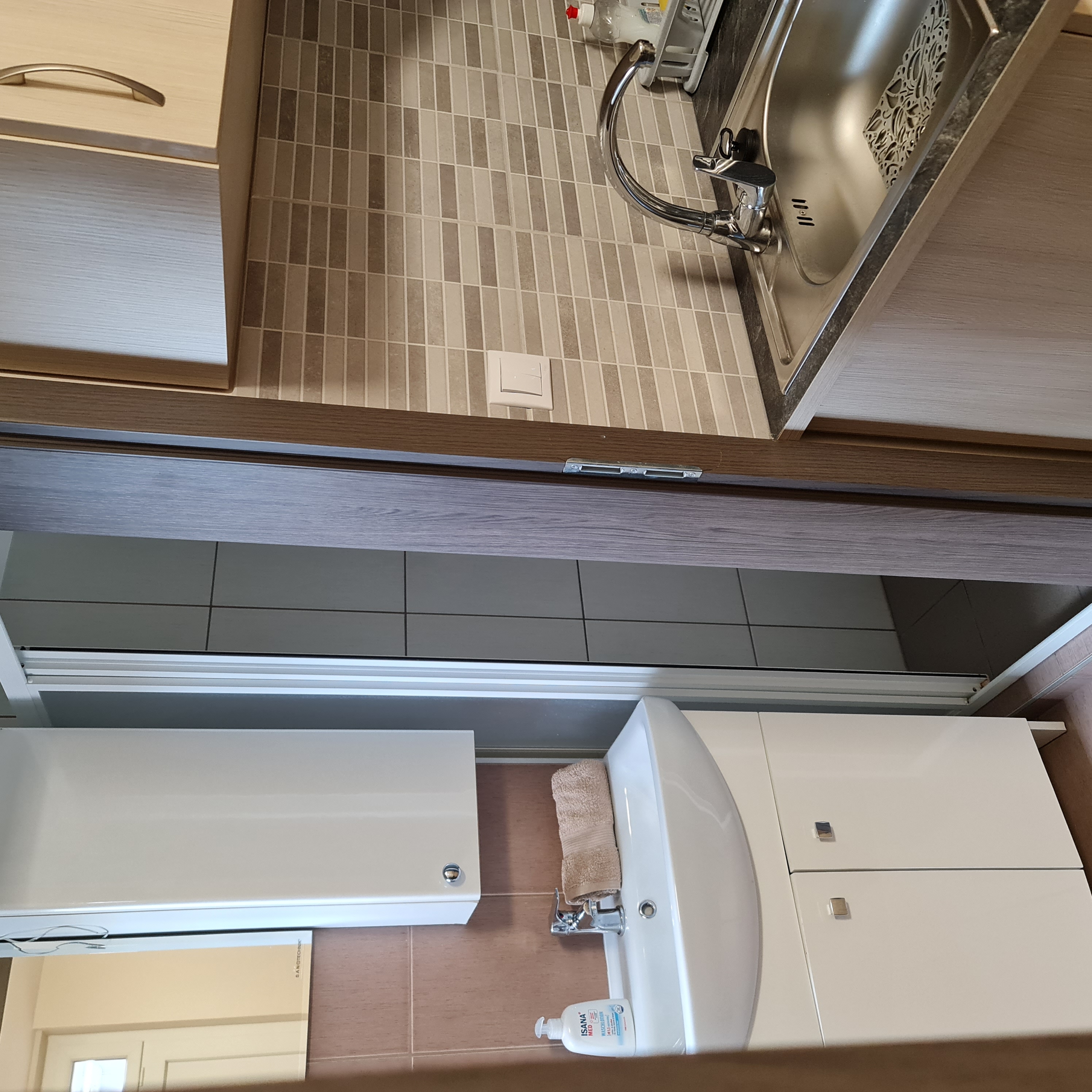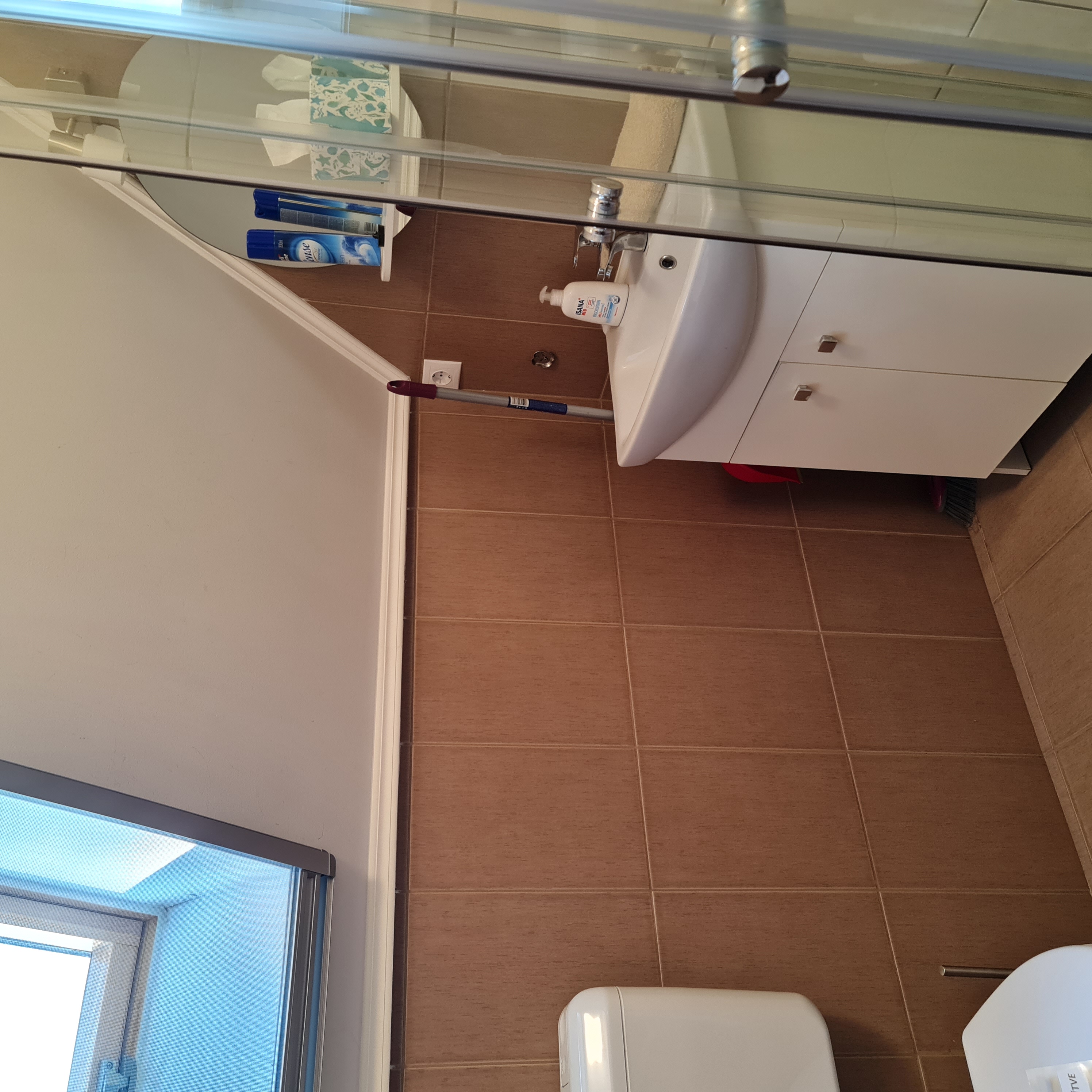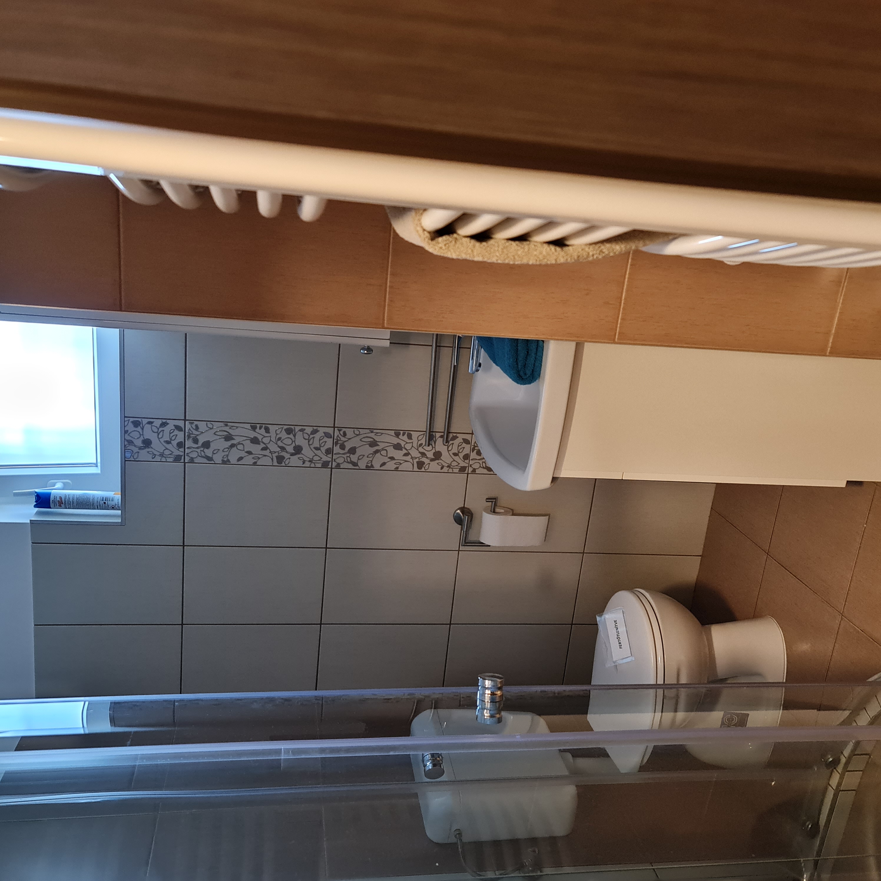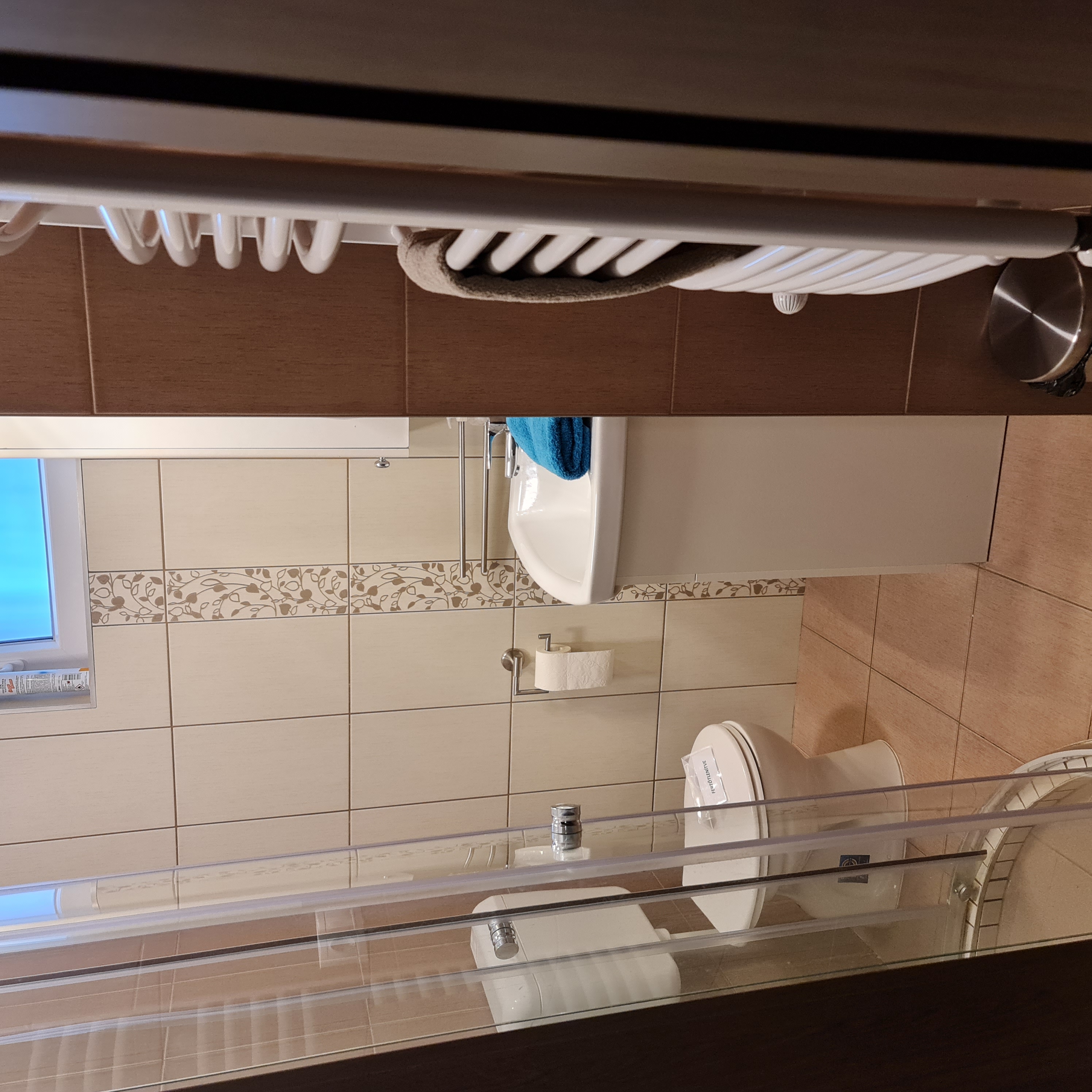 Fürdőszoba Zuhanykabin + WC egy légtérben, kéztörlő, hajszárító, folyékony szappan, WC papír bekészítés